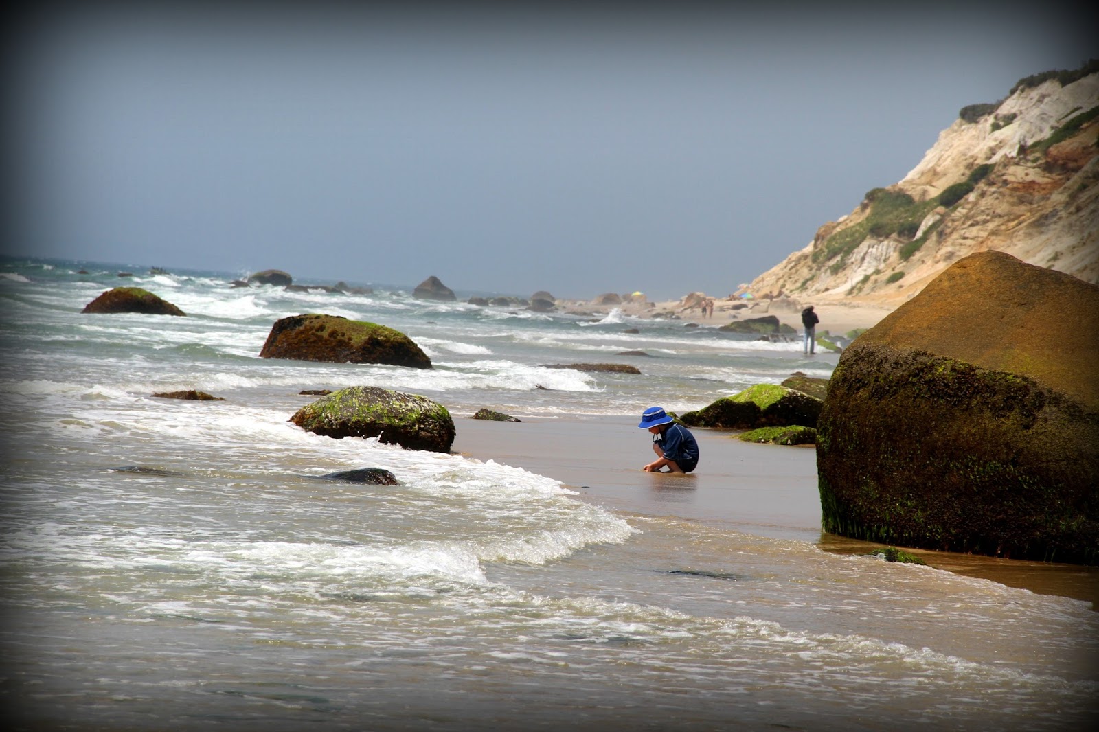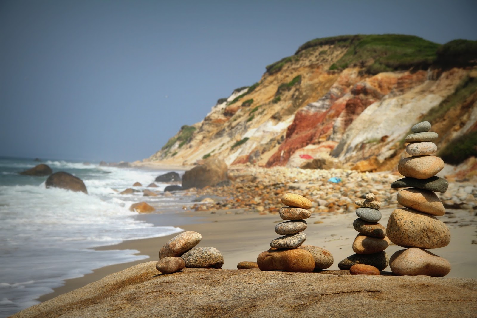 Rather than reinvent the wheel, I’m stealing words from Wikipedia below… I hope you don’t mind. Our favorite beach on the Vineyard is Moshup Beach, just below the Gay Head cliffs, now known as ” Aquinnah”… a town located on the most rural location of the island. We love it for it’s rugged natural beauty. Because of all the rocks, I don’t recommend it for swimming.. but bring your beach chair, suit for dipping and a good book and you’ll find peace in abundance. There is a hike from the parking lot way down to the beach itself, but it’s a pretty walk at that… and you can drop off the day’s supplies right near the beach before you park in the lot.