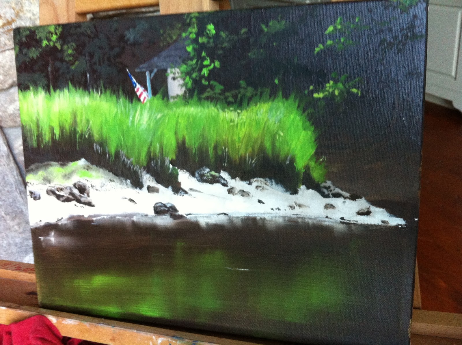 Now that the family is just about grown and I don’t have to punch a clock at an office somewhere… I want to encourage my creative side again. I’d love to pick up an instrument and play again, but my hearing impairment hampers that tremendously. I have no excuse not to pick up a pencil or paint brush though, and at the beginning of the summer I had a moment. I was kayaking down the Menunketesuck River with camera in tow… and witnessed this moment of morning summer light and reflection on water that I felt could be a painting. So I took the picture and studied it at home.