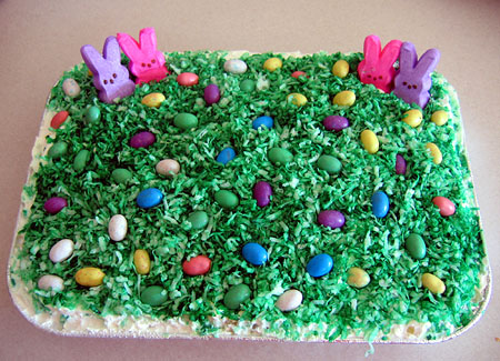 For decoration, mix a couple cups of coconut with a few drops of green food coloring and sprinkle on the Cool Whip like grass. Add Peeps and candy eggs to make your own Easter diorama.