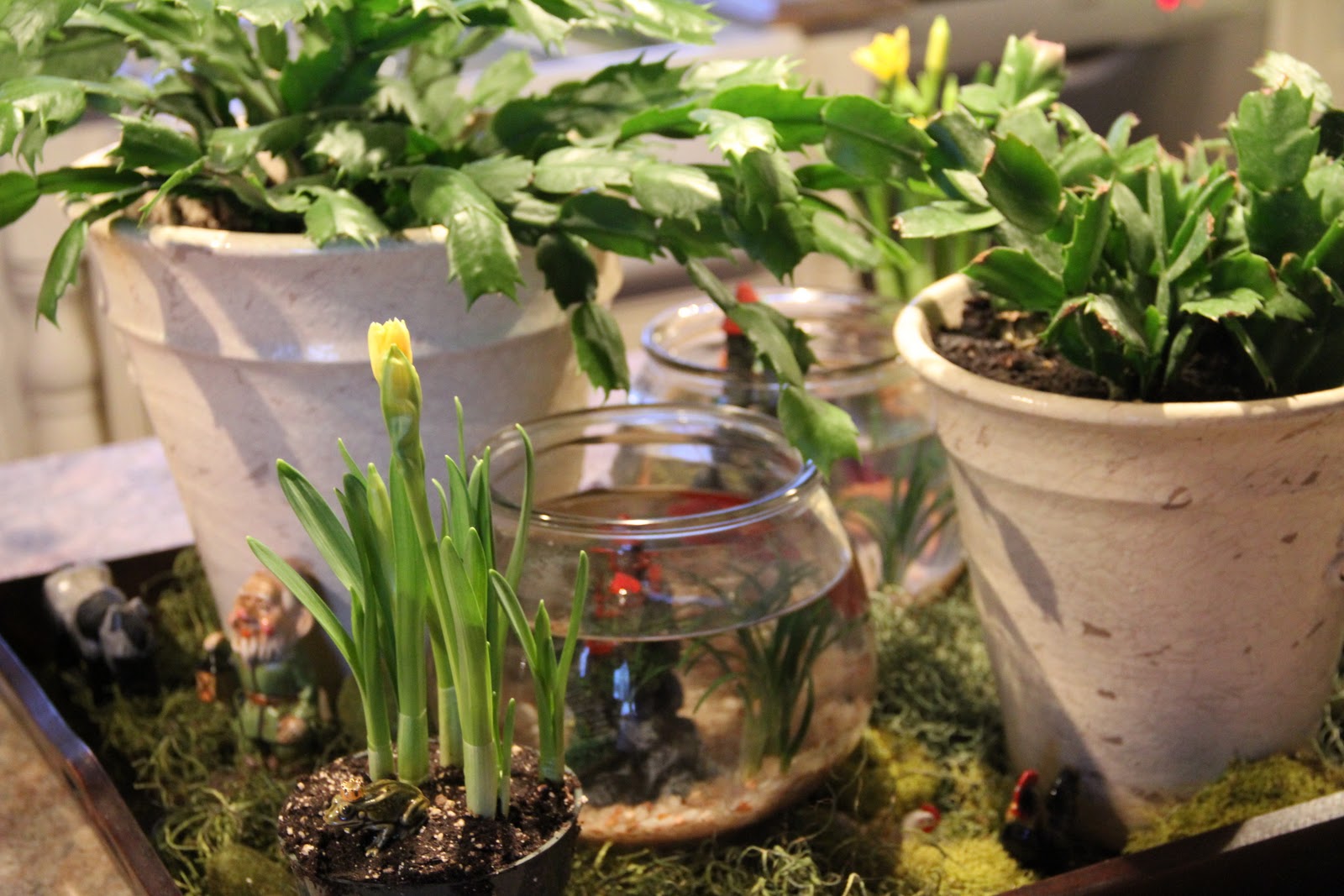 Your little garden is so very cool! I love the little fish bowl and frog {you are so funny!}. It is so nice to see some green, it's snowing here AGAIN!