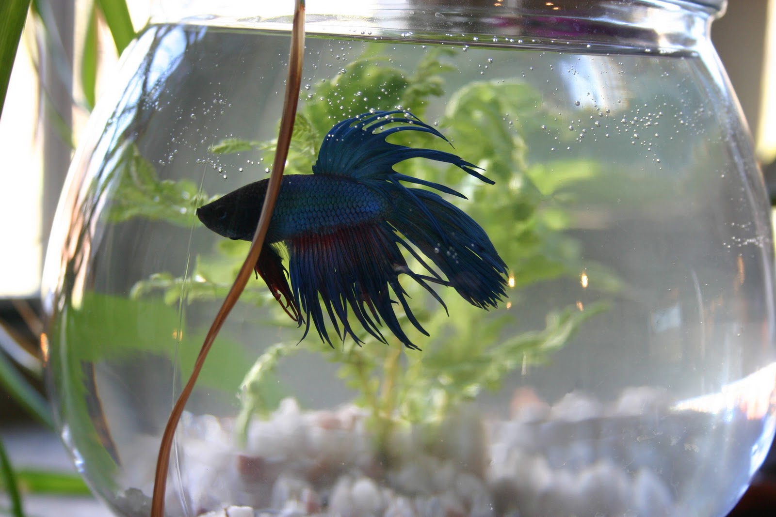 Henry’s home is just a small goldfish bowl with gravel and a live plant. It’s not the tank I’de prefer to see him in, but for now it’s five times the little plastic container he came in and already he’s livelier and spreading his fins like he’s courting the ceramic chicken sitting next to him.  I’ll be sure to keep the water temp around 75 degrees away from draft and I’ll do a partial water change with distilled water every five days or so to keep the ammonia level down.  A water change in this type of bowl is simple with a  filled gallon water jug  kept under the sink. It will be room temperature and distilled when I’m ready to use it.  Betta food is easy too, just don’t pollute the tank with too much of it by following feeding instructions on the container.  I also like to buy brine shrimp and blood worms on occassion to supplement their diet.