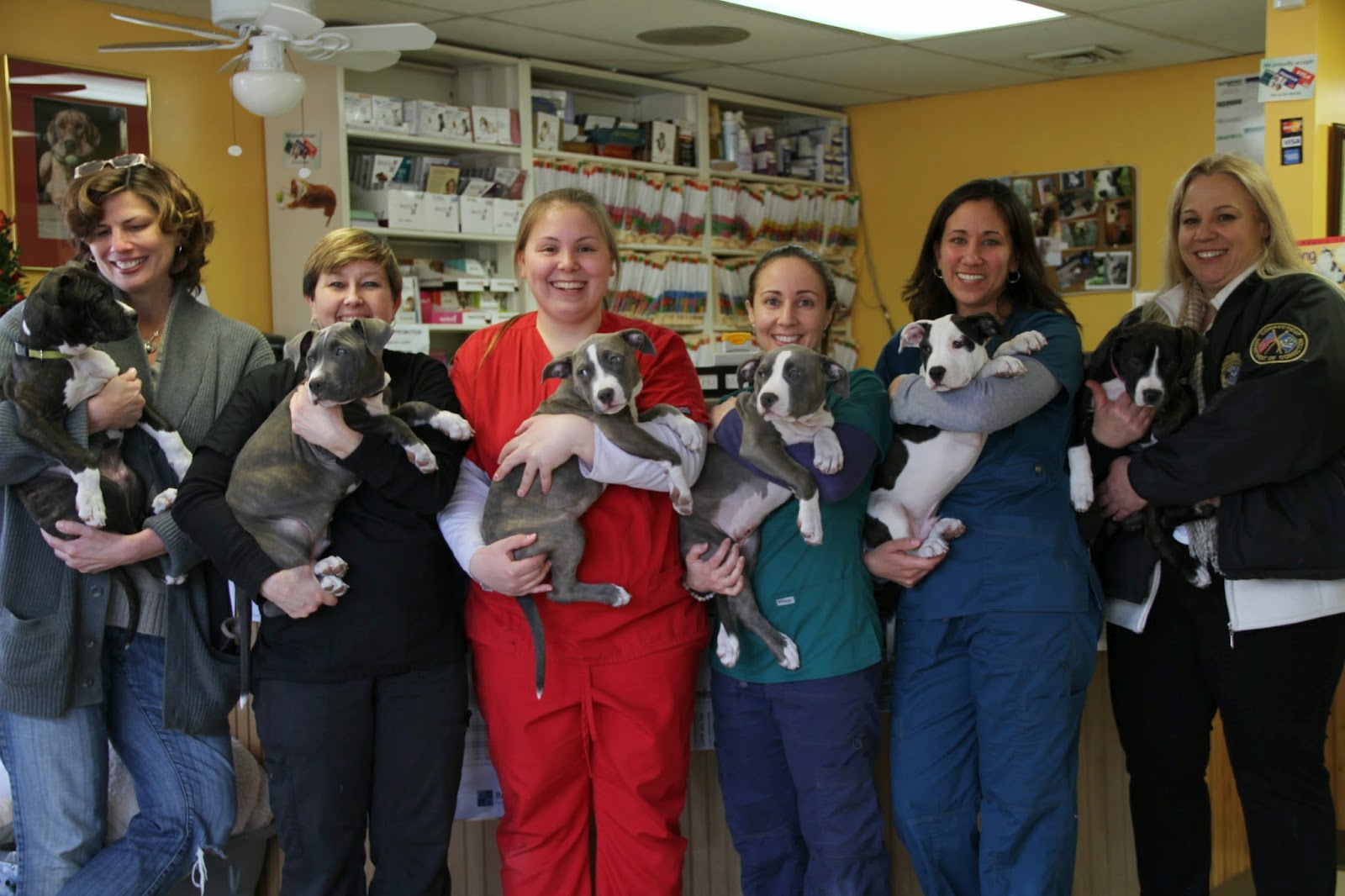 Well it’s official! The boys and girls of the First Graduating Class of the Red Dog Project are going to their forever homes! The program is a huge success and another litter of pups have been pulled from the streets and are on their way to the York Correctional Institute for training. The pictures below were taken at the Veterinary office today after the pups had their final visit before going home with their adopters.