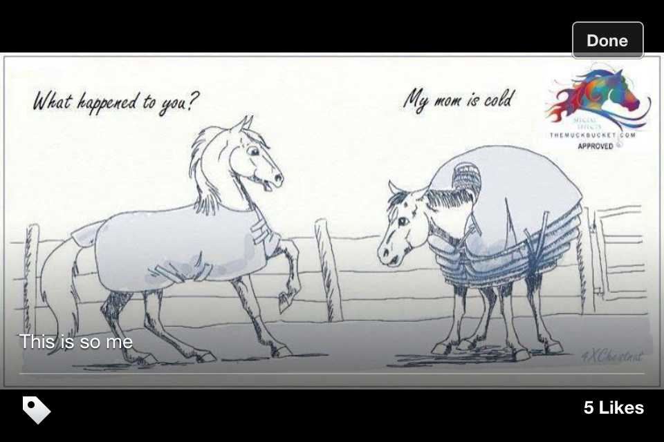 This cartoon below is hilarious…. because some of us horse people go just a little nutz with all the blanketing of horses we do during cold weather months. Truth be told, if horses are left to their own devices, they grow a decent coat and as long as they have plenty of food, good body weight and shelter to get out of the bad weather, they don’t really need blankets. I blanket Opie because he was bred to be a show horse and has never grown a really thick coat. So to make me feel better, he has a winter blanket. Our show horse Max is blanketed because he also doesn’t grow a thick coat, and we don’t WANT him to because he is worked almost daily and the sweating and drying would be a real nuisance and not good for him if he had thick winter coat hair.