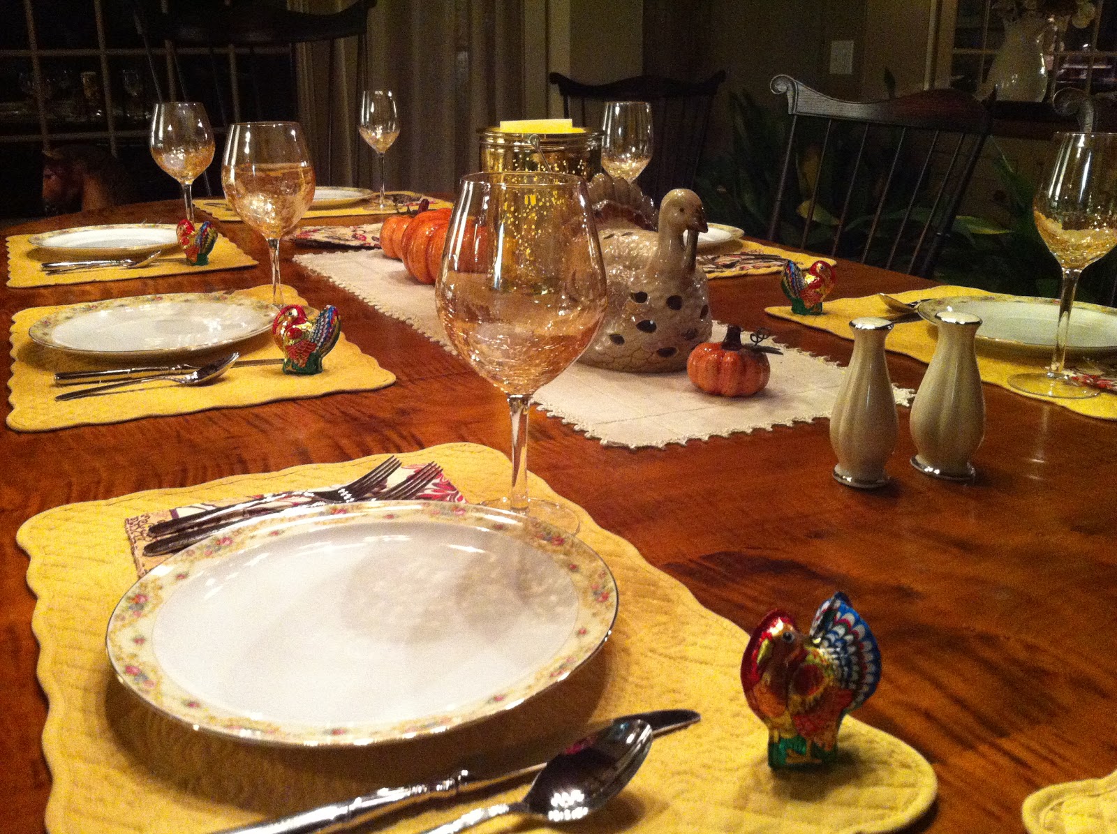 1. Your table looks awesome, the turkeys are the opposite of YUCK, they're very cool, and I would love a piece of that pie.