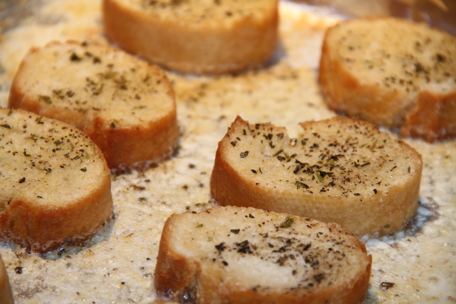 Meanwhile, back at the counter take a loaf of stale bread and cut it into rough pieces. ( I used a fresh loaf of french bread )  Melt some butter…if I told you how much butter I used, your arteries would collapse! but I don’t think a stick is unreasonable, do you?…  ( I don’t!  I used a stick too!)   pour it on bread pieces, spinkle some herbs…Oregano, Basil and Garlic,  Pepper,  Salt. Slip the bread into a hot oven and bake for the last thirty minutes of the cooking soup.