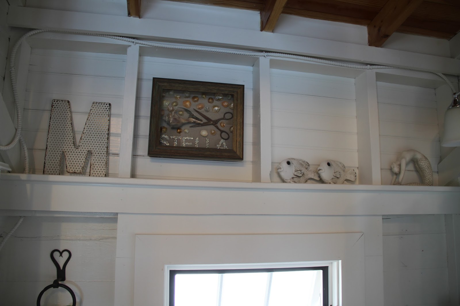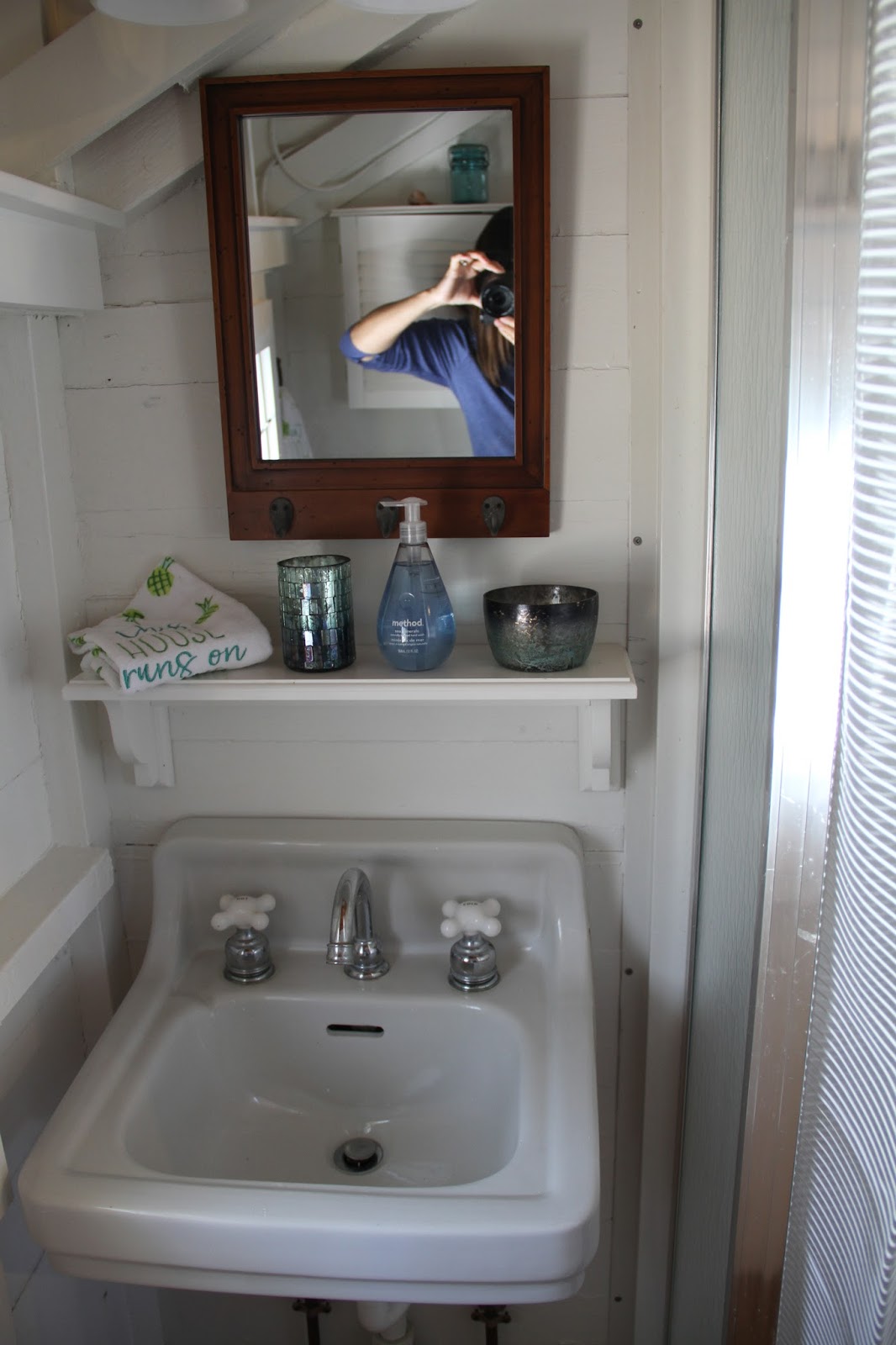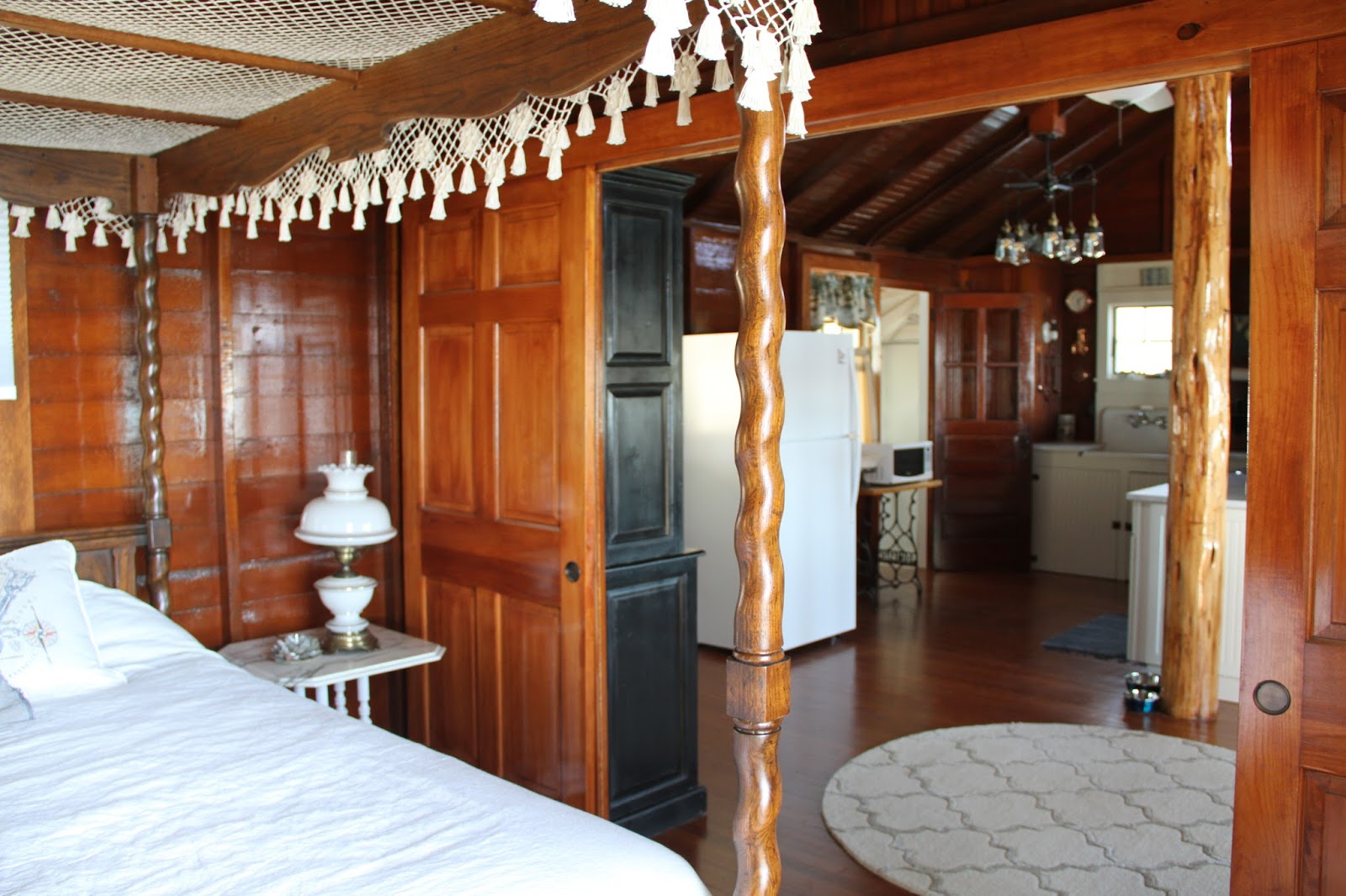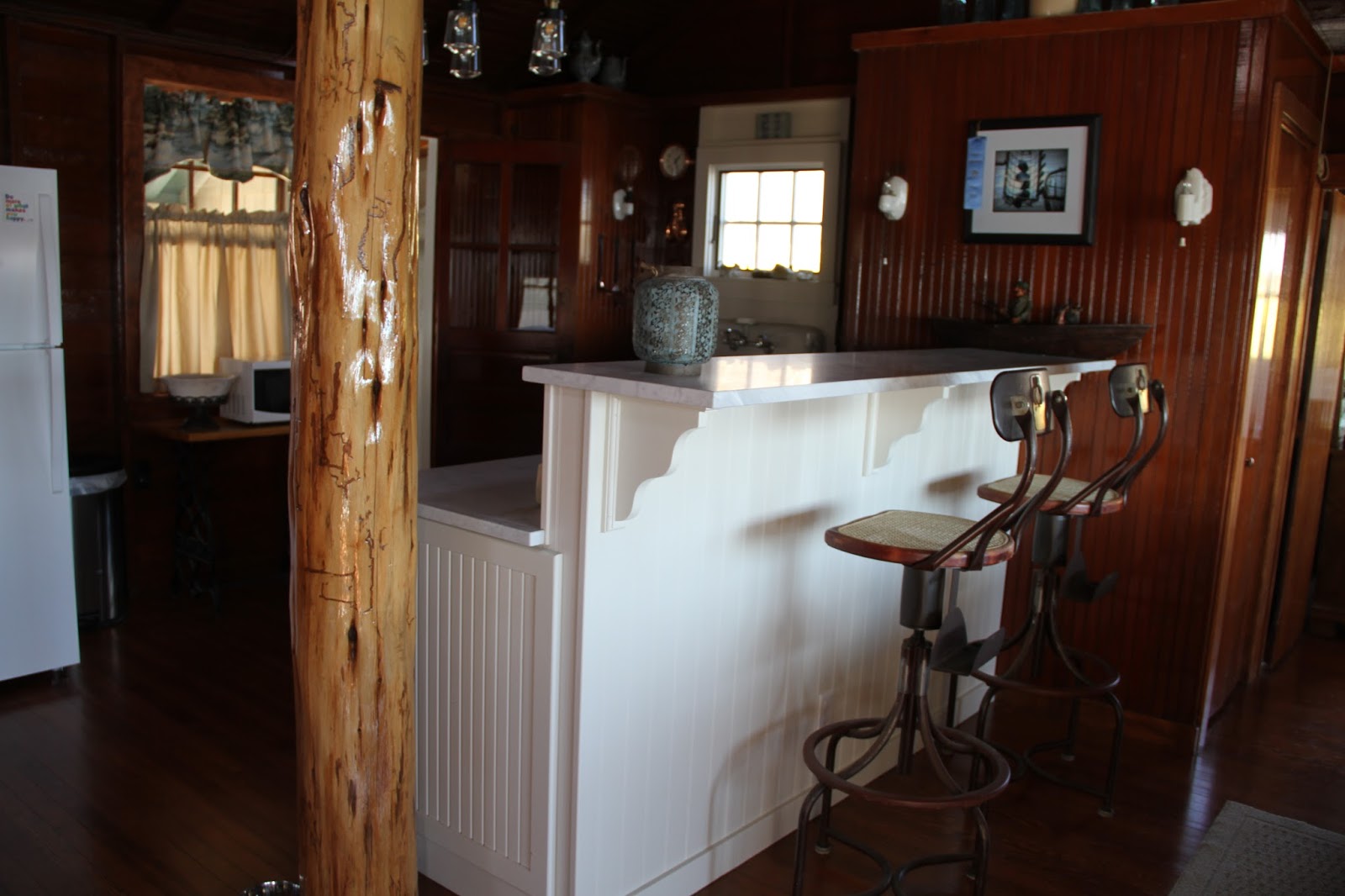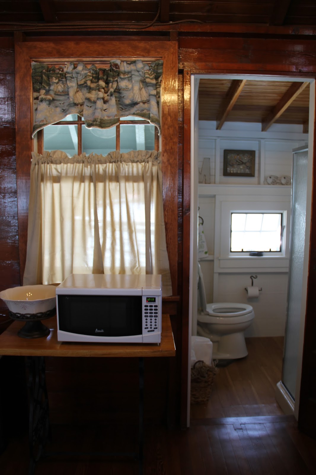New light fixture too, and you’ll notice how everything is SHINEY!   I walked into the cottage one day and wished I had brought my dang glasses. The Mr. laughed and said.. well, I wanted it to look like one of those antique boats in here, the high gloss wooden variety!   He got his wish….