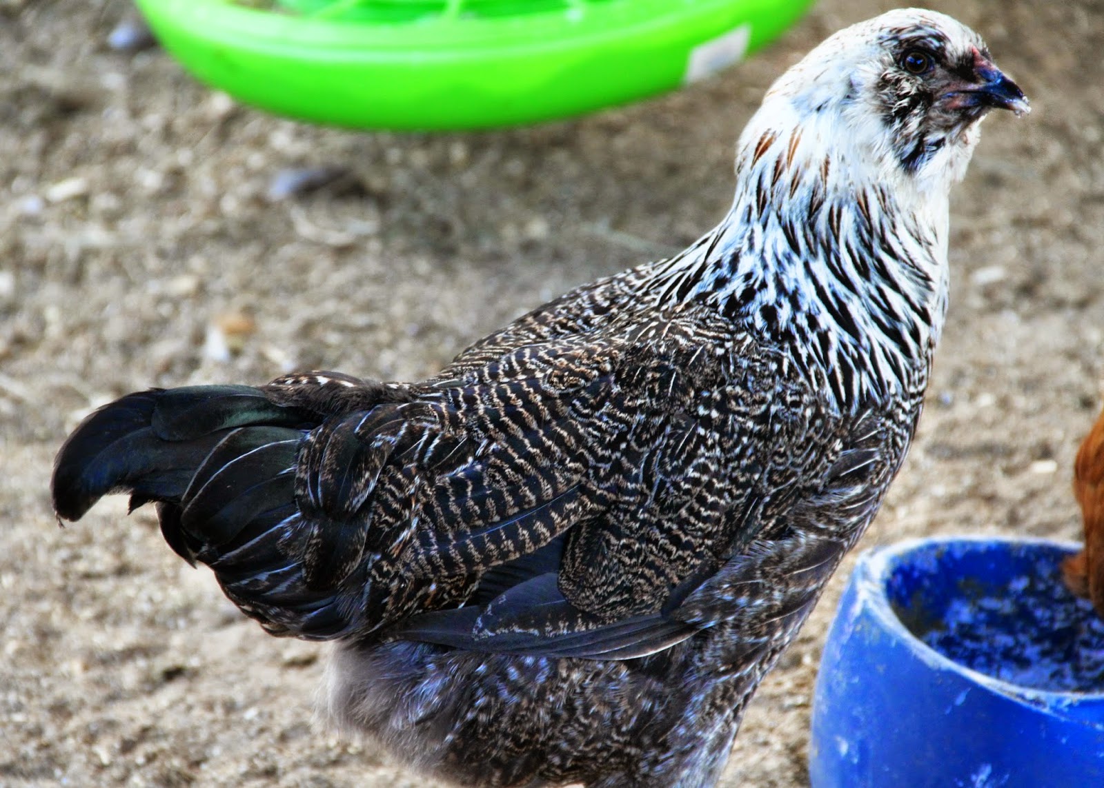 This is Bellatrix.. the little brown chick who sat on my son’s shoulder. She is a blue egg laying Auracana (Sp?) … and what an unusual feather color pattern she has!