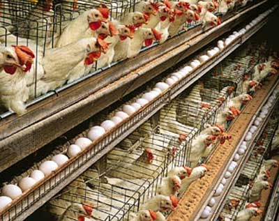 The reason local farm raised eggs are so much better? Diet and living conditions are the simple answer. While commercial chickens might be given a good quality feed, they don’t get anything else.. like yogurt, lettuce, raisins, tomatoes, apples, sunflower seeds, Cheerios! All of which my hens enjoy. They also get to roam around a little in their chicken yard, instead of extremely cramped quarters or NO MOVEMENT AT ALL… see below.