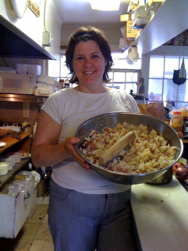 Sitting right on the Connecticut River with dock space for boaters who want to come in for a meal, it’s the perfect place to bring a picnic basket with a bottle of wine, a table cloth and a candle or two. The tables are colorful and don’t really need adornment, but they welcome your “Input” and many people bring their own ambiance. They don’t serve alcohol, but you are welcome to bring your own. That’s just what the folks next to us did….