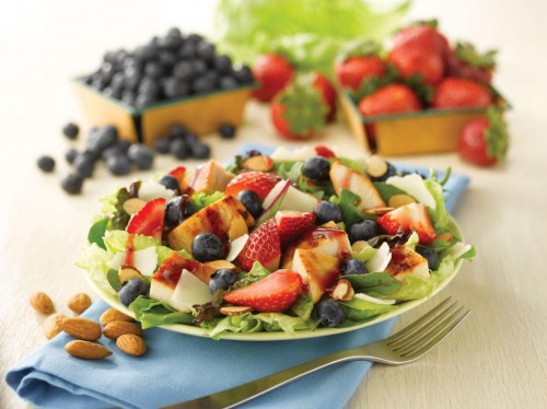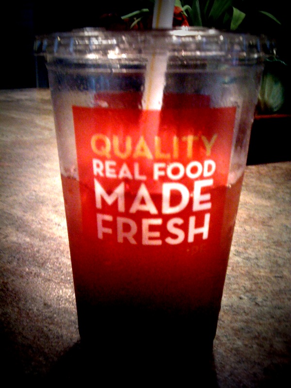 HOWEVER… the other day I was out running those errands and it was cold and rainy and I was hungry. I didn’t want to get out of the car either… cats and dogs kinda rain. My choices in the town I was in were McD’s and Wendys. Now, McD’s hasn’t done much at all to improve their menu, and if you ask me I think the quality of their usual stuff is getting worse. I pulled into Wendys instead to see if their menu had improved. Lo and behold!!!… I see a big poster with a picture of a beautiful salad. I order it… and the new berry tea they advertise.
