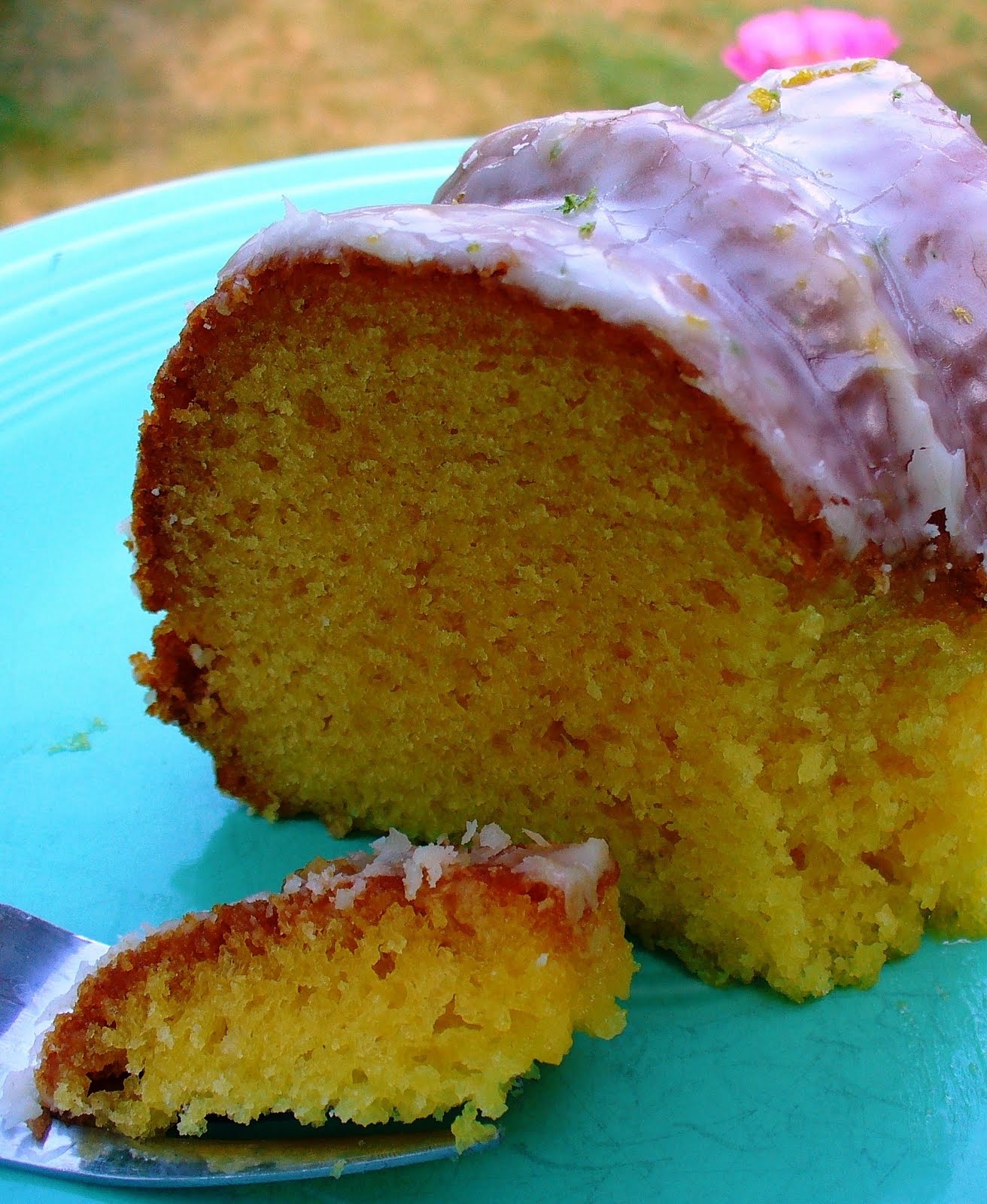 8. Poke holes in cake with a wooden skewer or the tines of a fork, then spoon hot glaze over